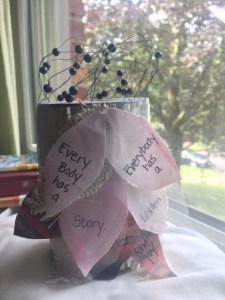 I keep it on my desk to remind me that everybody has a story, every BODY has a story, that my calling is to listen for these stories, breathe with these bodies, connect with my fellow earth travellers in and out of the classroom and share the joy of this practice. (My thought process and my new understandings of this piece are below.)*