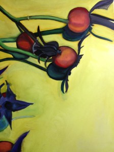 Rose bushes that aren’t well groomed grow rose hips — a fruit which holds rose seeds. And like all things in nature that are left to a little chaos, the lack of control can lead to wonderful sustenance. You can clip rose hips and make tea with a few of them, and jam if you have buckets of them. They have huge amounts of vitamin C and anti-oxidants. Thinking of eating this fruit reminds me of childhood. I can remember as a child having rose water liberally sprinkled on food. Or the Chartreuse green of Rose’s Lime Juice in a glass of soda and raw sugar. (Perhaps this is where the green-yellow comes from in the background of this painting.)
